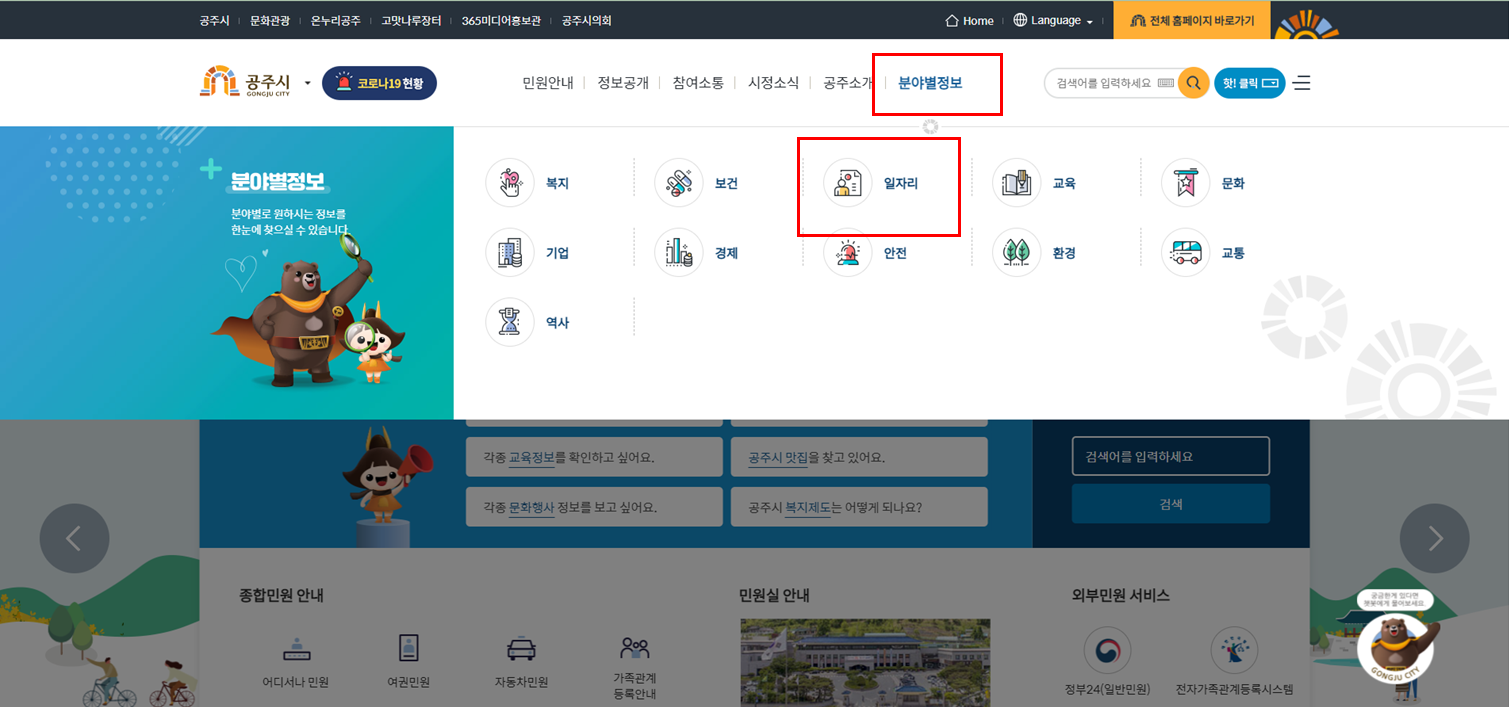 ① 공주시청 홈페이지를 들어갑니다. 상단 메뉴 우측에 분야별 정보 > 일자리를 선택하세요.