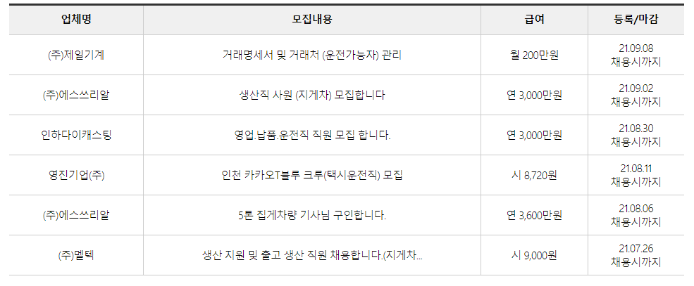 운전부문중에서 지게차는 1건이 있는데, 지게차 운전은 사내의 경우 3톤 미만이 많이 있습니다. 교육이수를 통한 자격취득이 용이하며, 시급은 경력에 따라 다르지만 9천원부터 시작하는 경우가 대부분입니다.