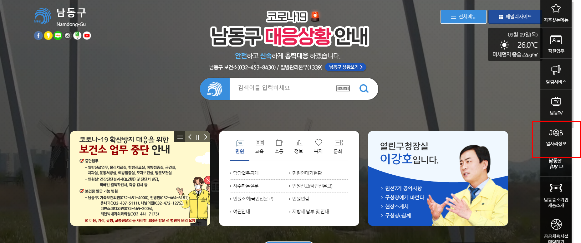 남동구청 홈페이지에 들어가서 오른쪽의 사이드 메뉴의 일자리 정보를 클릭합니다.