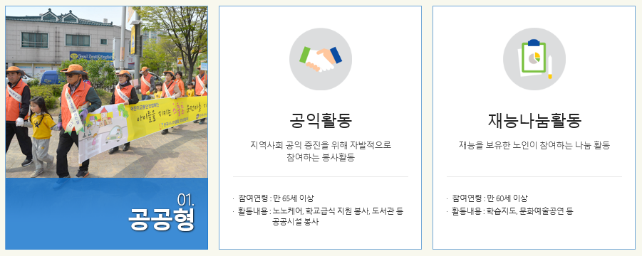 - 공공형 : 공익활동, 재능 나눔 활동으로 학교급식 자원봉사, 도서관 등의 공공시설 봉사, 문화예술공연 등이 있습니다.