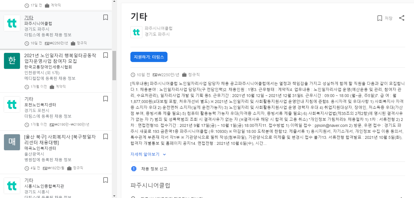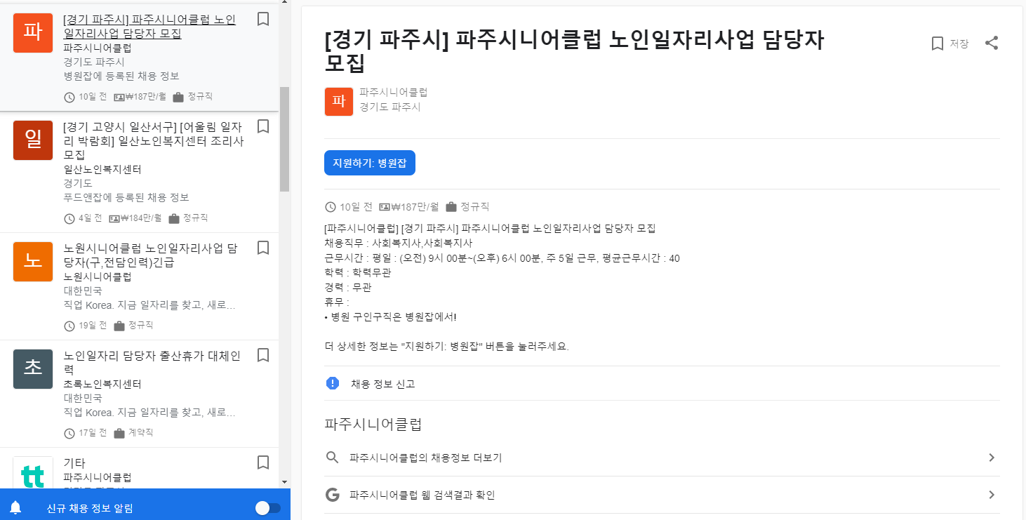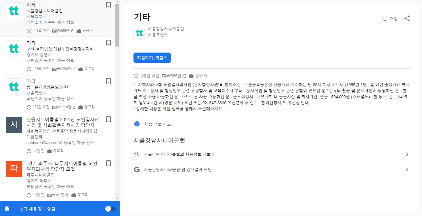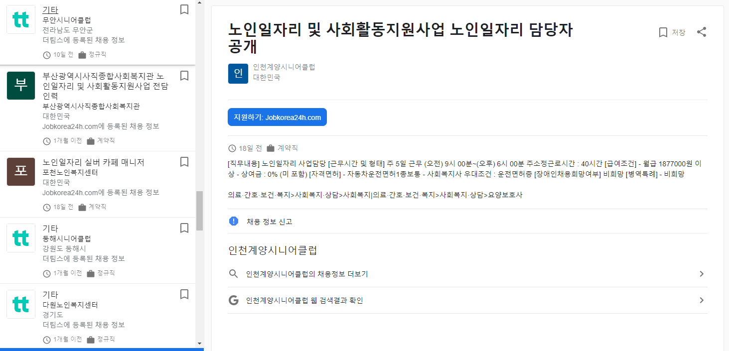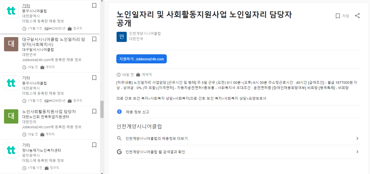 먼저 구글에 들어가셔서 "노인 일자리"를 검색해보세요. 포스팅 시점으로 44건이 있습니다.