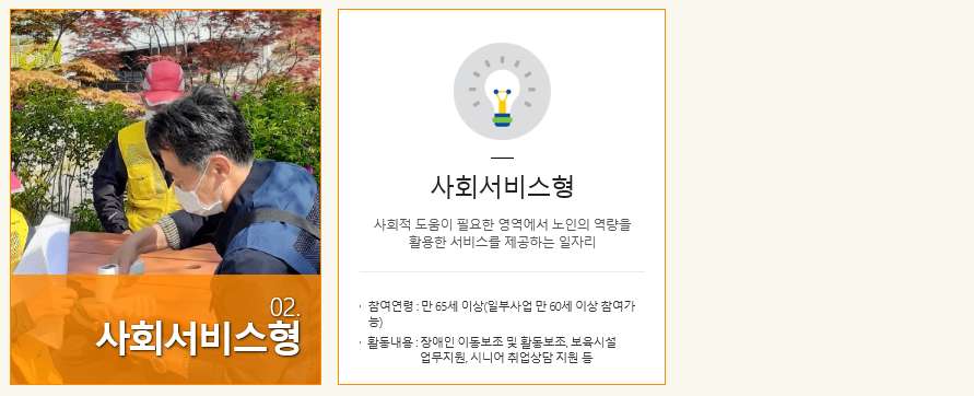 - 사회서비스형 : 사회적 도움이 필요한 영역에서 노인의 역량을 활용한 일자리이며, 장애인 이동보조 및 시니어 취업상담지원 등이 있습니다.