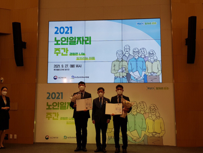 노인일자리사업 우수기관을 대표해 지자체 2개소, 수행기관 3개소, 유공기관 1개소 등 장관상 6개와 올해 신규로 지정된 고령자 친화기업 중 대표 1개 기업에 대한 지정서가 수여되었다. 그리고 노인일자리 우수기관의 주요 사업 사례를 소개했는데, 먼저 복지부 장관상 대상을 수상한 미추홀노인인력개발센터는 노인일자리를 활용한 독서 논술 지도자를 양성, 관내 초등학교 학생 대상 비대면 수업을 진행하여 초등학생들의 교육 공백을 최소화했다.