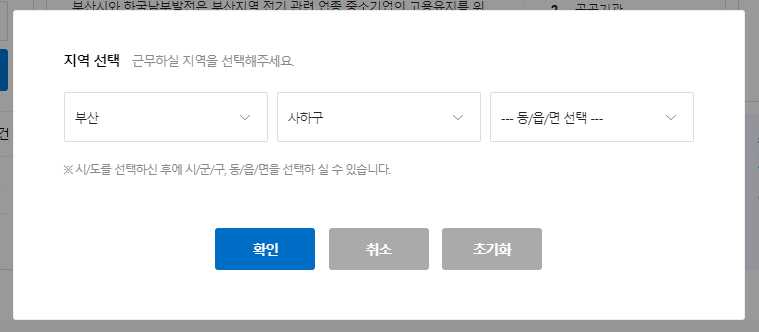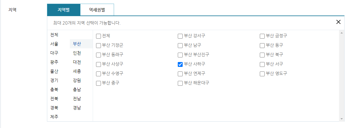 ② 지역검색에서 부산 > 사하구를 선택합니다.