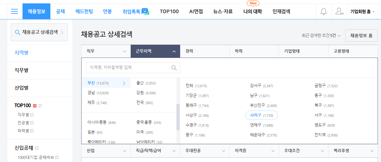 ② 채용정보를 누르시고, 지역별 세부메뉴로 들어가서 부산 > 사하구를 선택하세요.