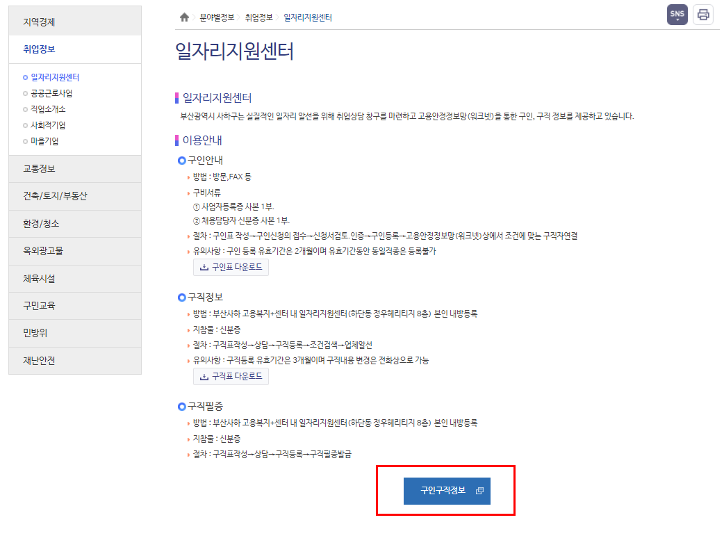 ③ 일자리지원센터로 연결됩니다. 하단의 구인구직정보를 클릭하시면, 부산일자리 정보망으로 이동하게 됩니다.