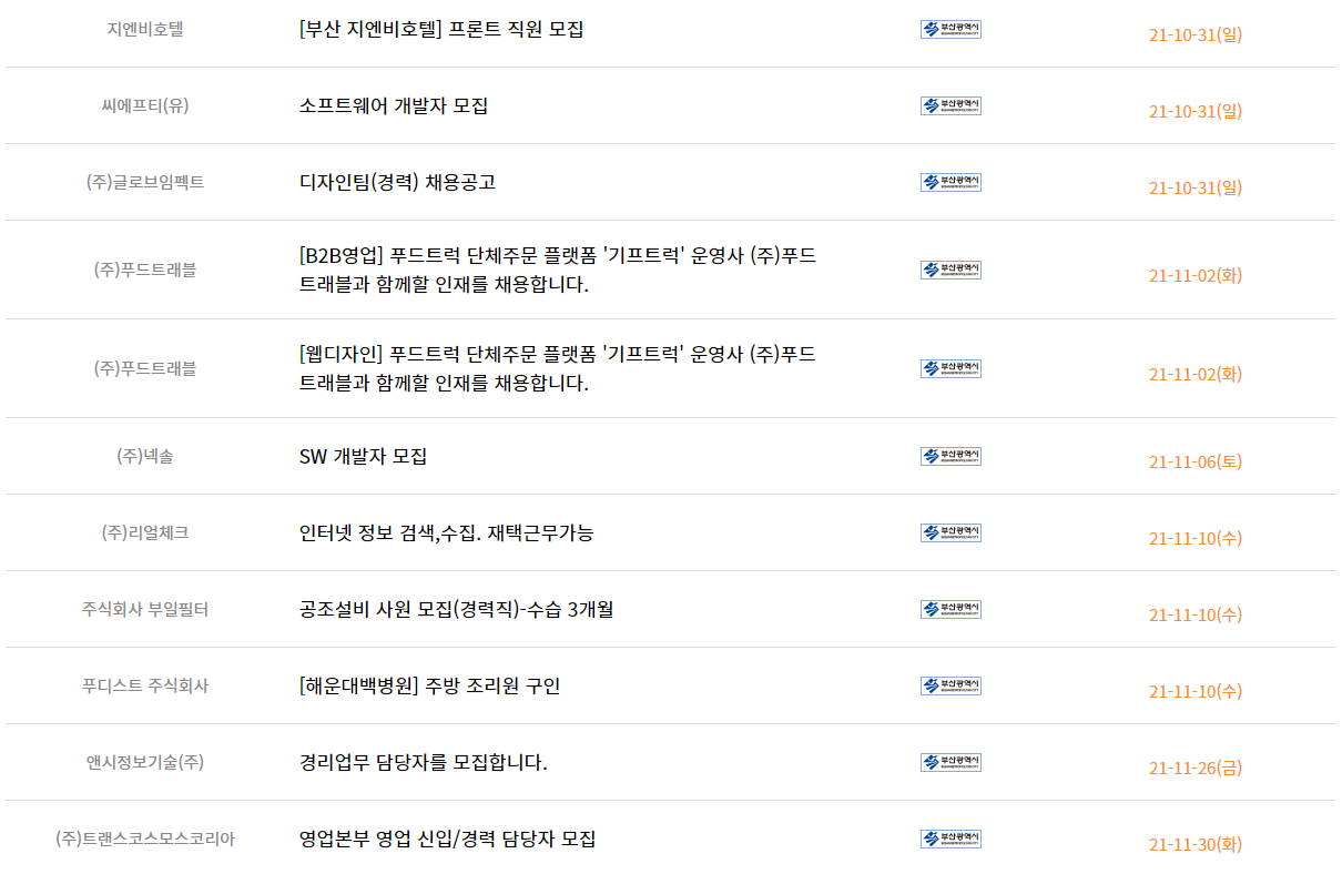 부산일자리정보망은 부산지역에 있는 구인정보가 게재되어 있습니다. 참고하시기 바랍니다.