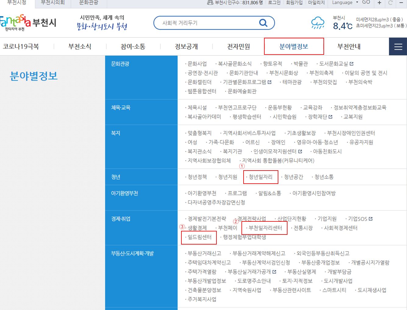 ① 부천시청 홈페이지를 들어갑니다. 부천시청에서는 분야별로 일자리 정보를 다양하게 제공중입니다.