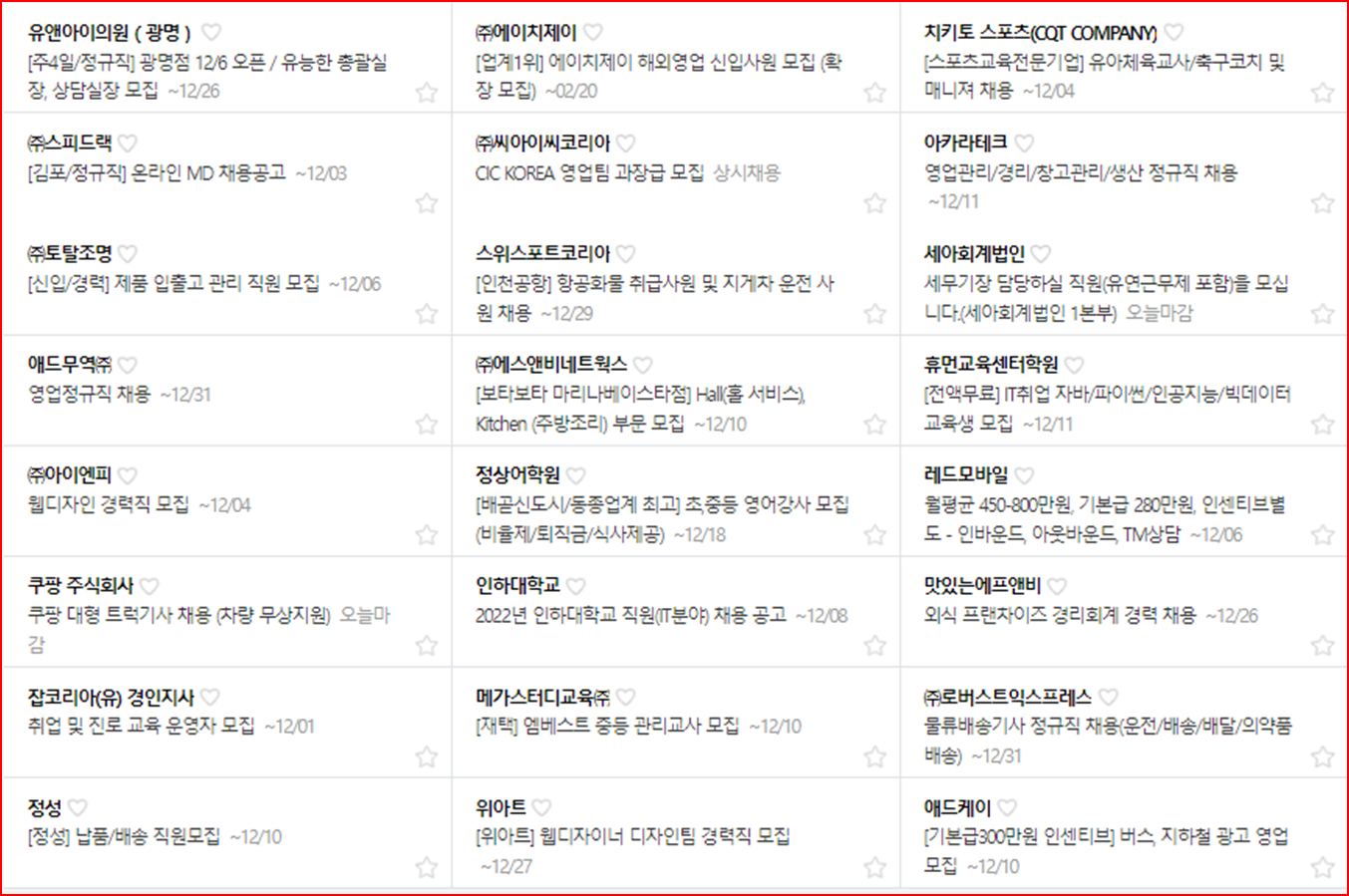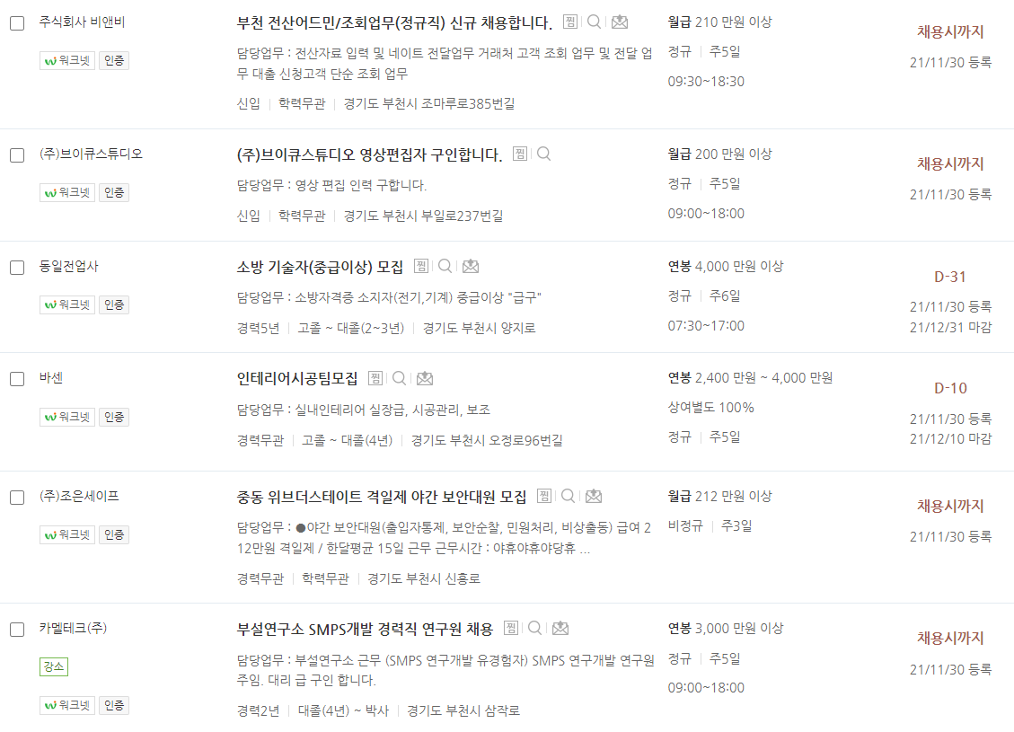 영상편집자, 부천전산 어드민, SMPS 경력직 연구원, 사무직, 유통쇼핑 판매/서비스직, 요양보호사, 경비/보안대원, 미화, 편의점 알바, 물류배송분야까지 다양한 일자리가 현재 게시되어 있습니다.