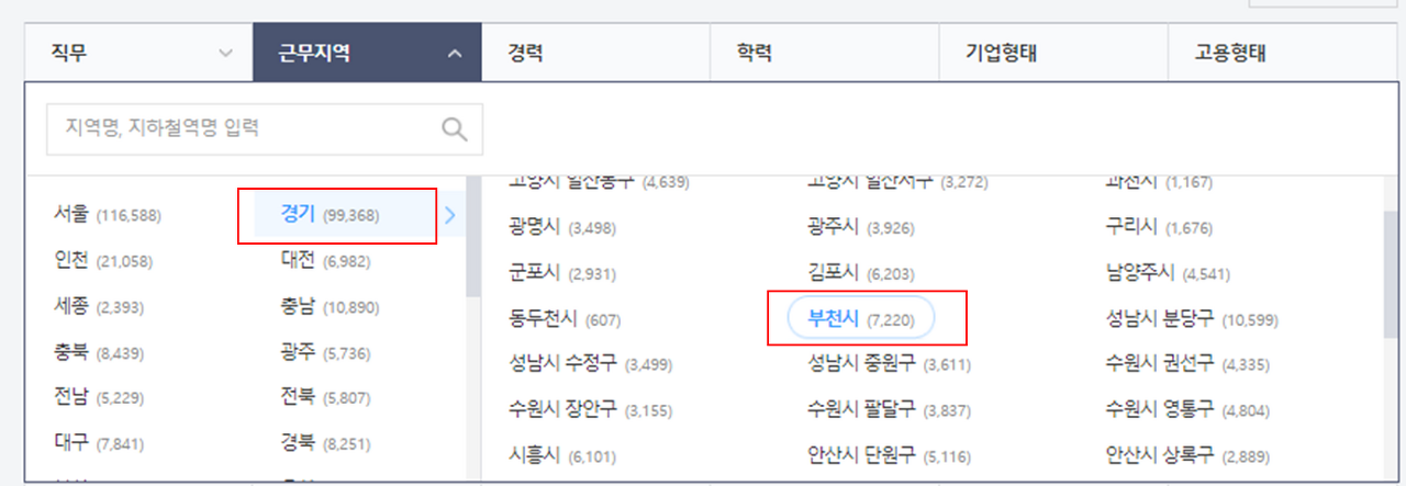 먼저, 잡코리아에 접속 후 > 지역별 세부메뉴에서 경기도, 부천시를 선택하시면 됩니다.