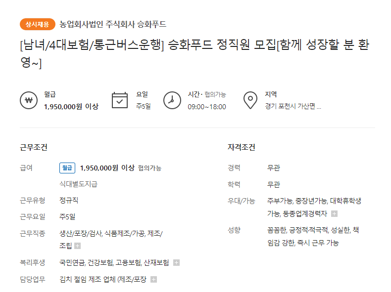 - 승화푸드 정직원 ㅣ 월급 195만원 ㅣ 주 5일 ㅣ 생산, 포장, 검사 가공, 제조