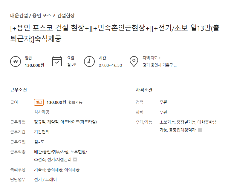- 경기도 용인 민속촌 인근 건설현장 ㅣ 전기, 초보 일당 13만원 ㅣ 월~토요일 근무