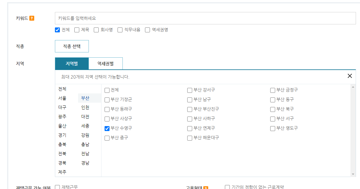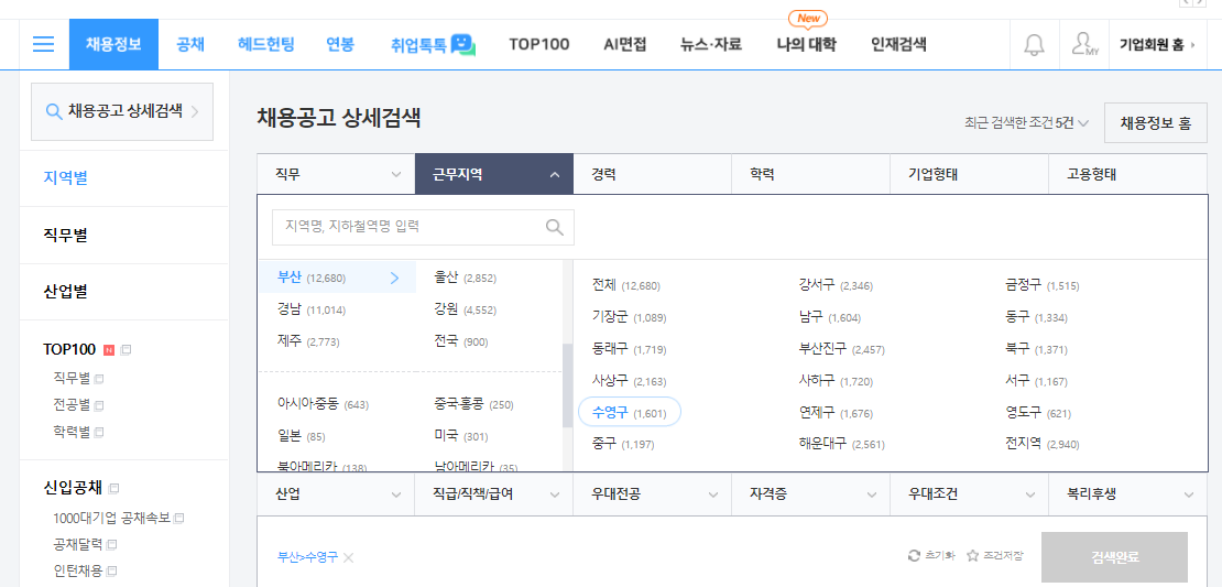 ② 채용정보를 누르시고, 지역별 세부메뉴로 들어가서 부산 > 수영구를 선택하세요.