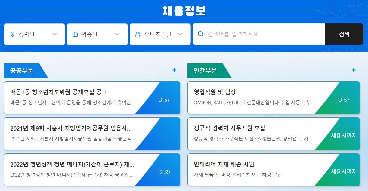 시흥시청에서 게시돼 공공부문 일자리이외에 희망하는 민간일자리를 찾으시려면 민간 취업사이트를 같이 활용하시는 것이 효과적입니다.