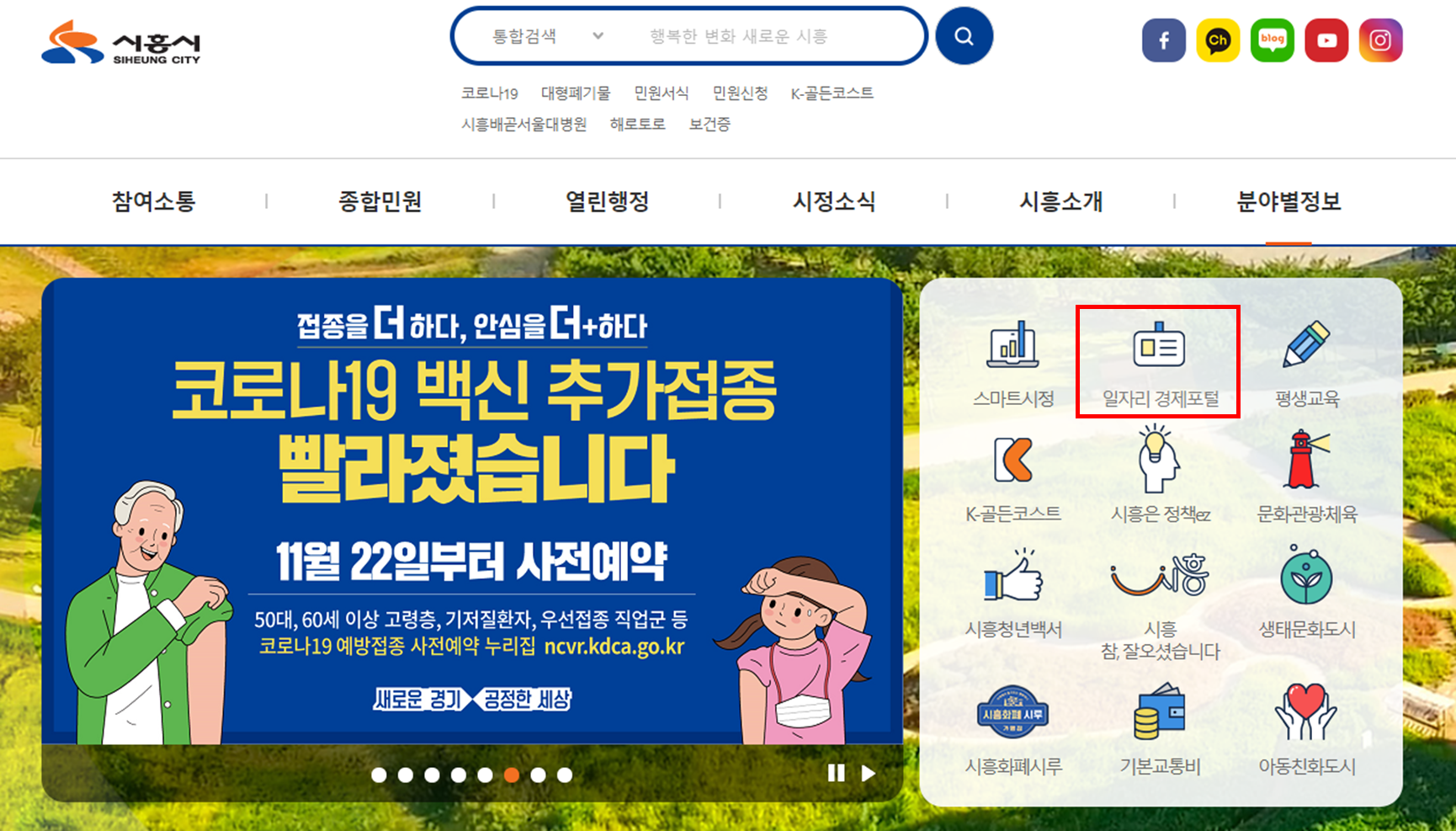 ① 시흥시청 홈페이지를 들어갑니다. 상단 우측 메뉴에 분야별 정보 > 일자리 경제, 포털을 선택하셔도 되고, 시흥시 메인 홈페이지에 '일자리 경제포털'이라는 아이콘을 선택하셔도 됩니다.