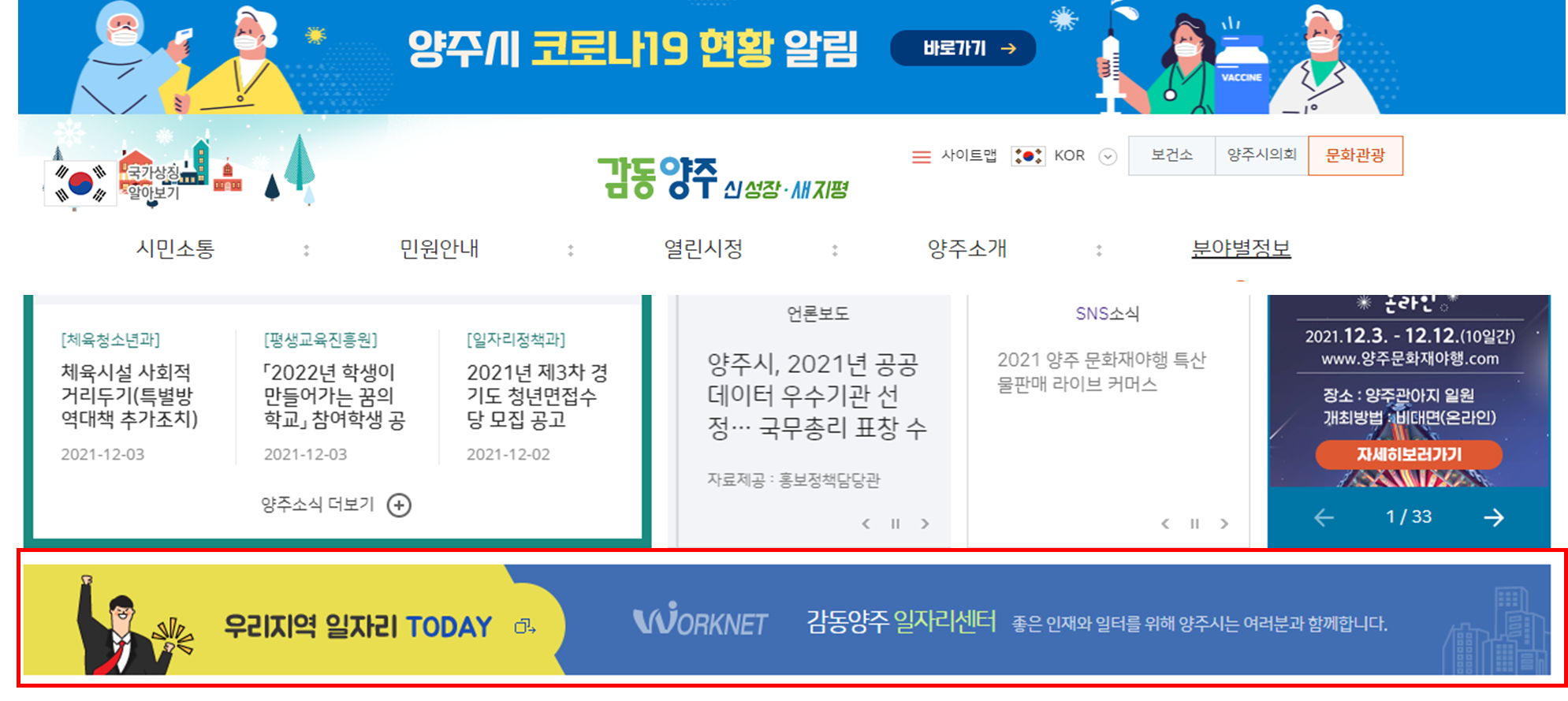 ① 양주시청 홈페이지를 들어갑니다. 제일 하단메뉴에 '우리지역 일자리 Today, 감동양주 일자리센터' 배너광고가 있습니다.