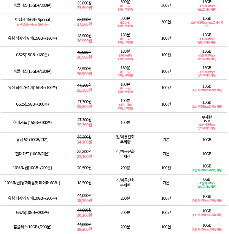 15GB부터 10GB까지 제공하는 상품과 10GB~5GB까지 제공하는 일반형 (가성비좋은 상품) 상품이 있습니다. 2.5GB이하 상품은 개인적으로 추천하지 않습니다.