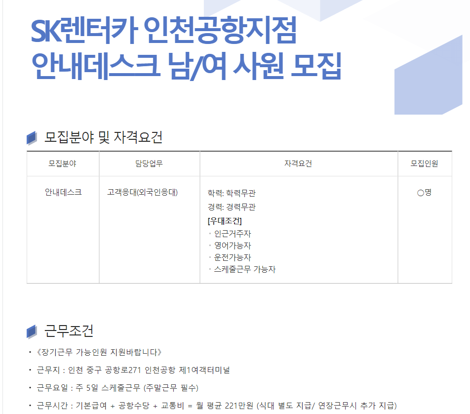 출퇴근은 공항 출퇴근 버스가 운영되오니 수도권에 거주하시면 편하게 지원이 가능하며, 지속적인 안내와 대응으로 업무강도는 있지만, 생각 외로 젊은 분들은 쉽게 적응하고 즐겁게 근무하는 편이라고 합니다.