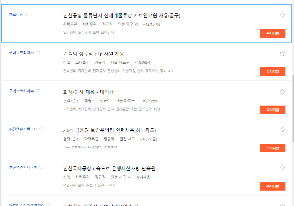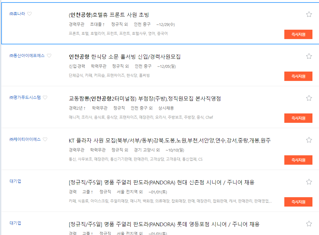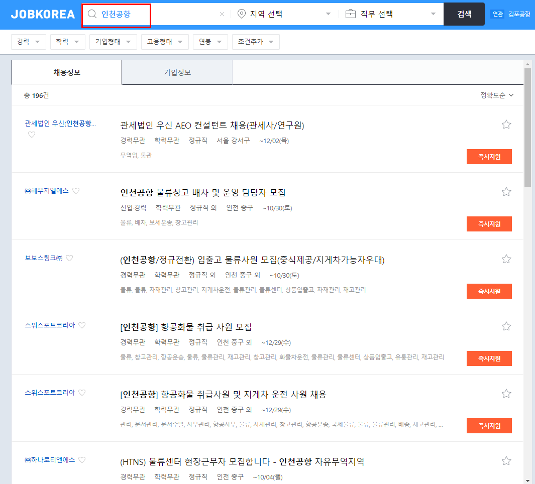 따라서, 잡코리아 메인화면이 뜨면, '인천공항'이라고 검색하시면, 아래와 같은 일자리 결과를 찾아볼 수 있습니다.