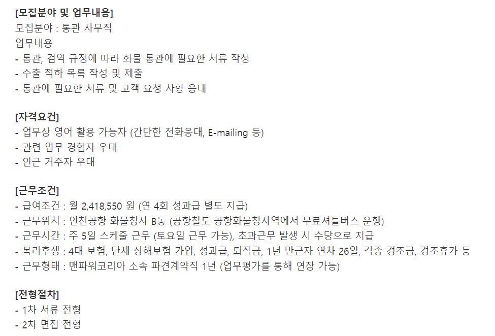 인천공항에서 상주하고 있는 기업들은 수출입 물건의 통관의 전반적인 행정처리를 다 해야 합니다. 통관 사무직이라고도 하고, 무역사무직이라고도 표현합니다.
