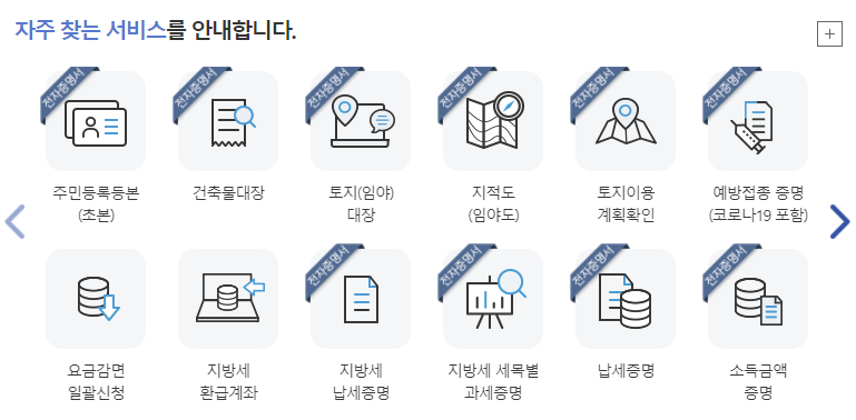 이외에도, 코로나예방접종 증명, 요금감면 일괄신청, 소득금액 증명, 병적증명, 운전경력 증명, 통신판매업신고, 농지원부, 기타 제증명등을 일괄 신청할 수 있습니다. 꼼꼼히 확인하시고 유용하게 확인하시기 바랍니다.