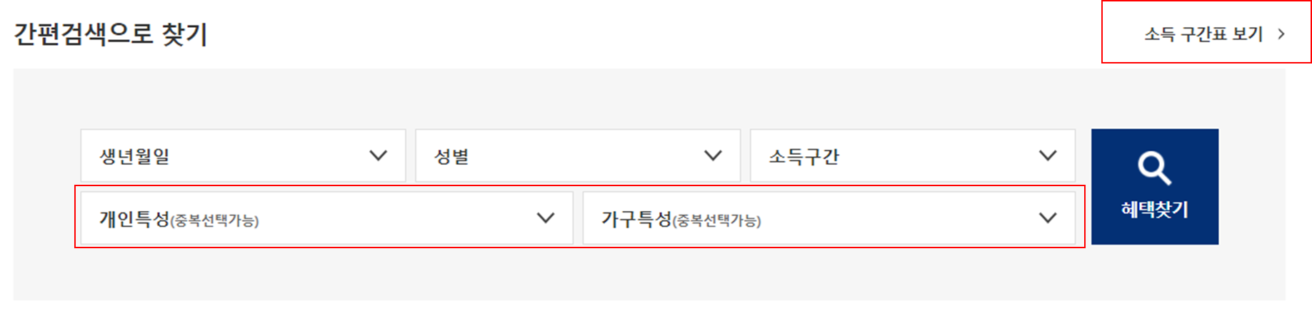아래와 같이 간편검색으로 찾으시면, 소득구간과 개인특성, 가구특성을 선택해야 합니다.