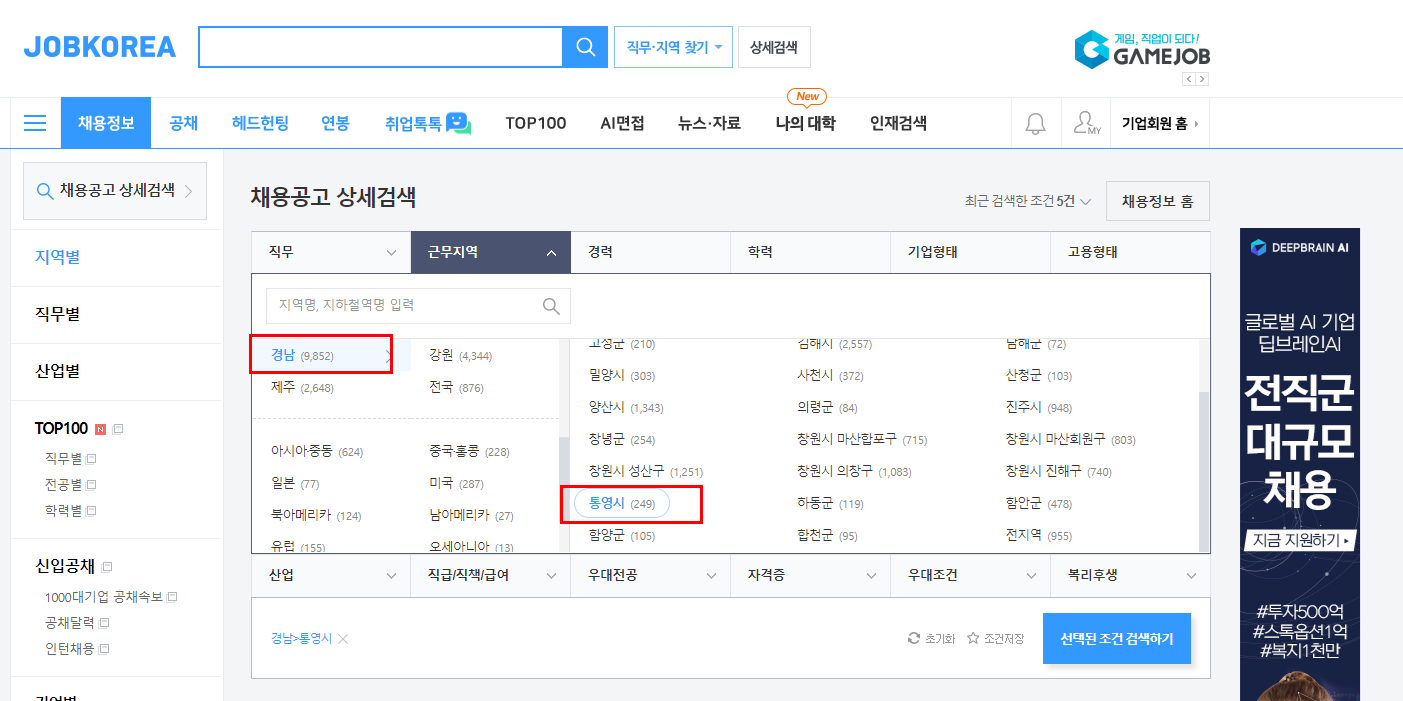 ② 채용정보를 누르시고, 지역별 세부메뉴로 들어가서 경남 > 통영시를 선택하세요.